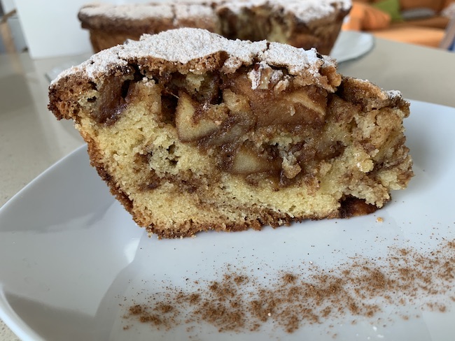 Ζύμη: Σε ένα μπολ βάζουμε ελαιόλαδο, ζάχαρη και χυμό πορτοκάλι και χτυπάμε με το σύρμα να διαλυθεί η ζάχαρη. Στη συνέχεια προσθέτουμε τα αυγά και ανακατεύουμε καλά μέχρι να έχουμε ένα μείγμα ομοιογενές. Προσθέτουμε το αλεύρι μέσα στο οποίο έχουμε ήδη ανακατέψει το αλάτι και το BP. Ανακατεύουμε με το σείρμα να ενωθούν όλα το υλικά. Βουτηρωαλευρώνουμε την φόρμα μας και με μια κουτάλα ρίχνουμε το 1/3 της ζύμης μας, απλώνουμε πάνω το μισό μείγμα απο τα μήλα. Συνεχίζουμε με ακόμα 1/3 απο το μείγμα ζύμης και απλώνουμε με το υπόλοιπο μείγμα μήλων. Τελειώνουμε με την υπόλοιπη ζύμη και χτυπάμε ελαφρά στον πάγκο μας τη φόρμα έτσι ώστε να απλώσει παντού. Στην επιφάνεια σκορπάμε λίγη καστανή ζάχαρη και ψήνουμε σε προθερμασμένο φούρνο στους 180 °C στη χαμηλή σχάρα του φούρνου. Θα πάρει περίπου 65-75 λεπτά. Όταν είναι έτοιμο πασπαλίζουμε με λίγη κανέλα και ζάχαρη άχνη.
